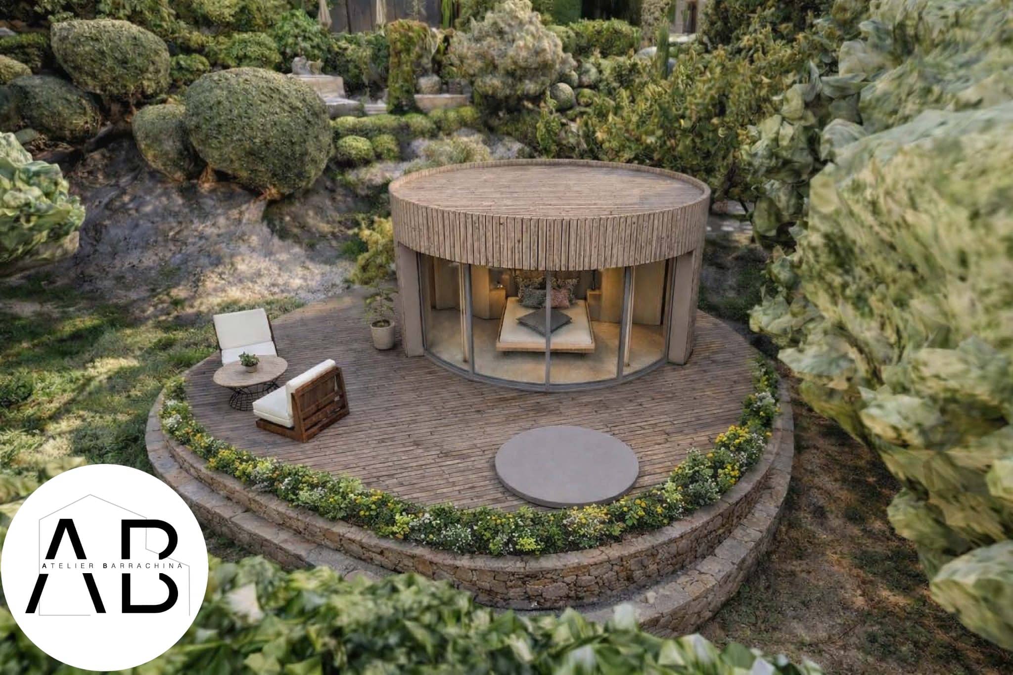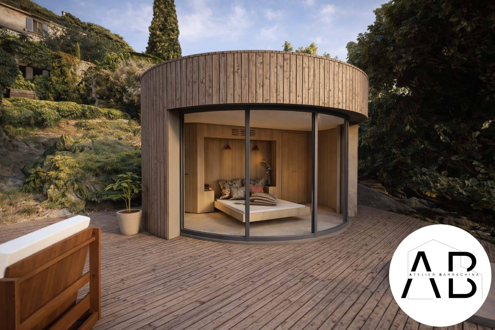 Cette suite d’exception de 19 m² ouvrant sur une terrasse de 50 m², dessinée comme un écrin circulaire, s’organise autour de sa majestueuse baie vitrée Lumicene — une verrière panoramique qui s’ouvre généreusement pour inviter le paysage à entrer. Ici, la lumière danse sur les courbes, l’air du maquis glisse jusque dans la chambre, et chaque matin commence face à la beauté brute de la Balagne.